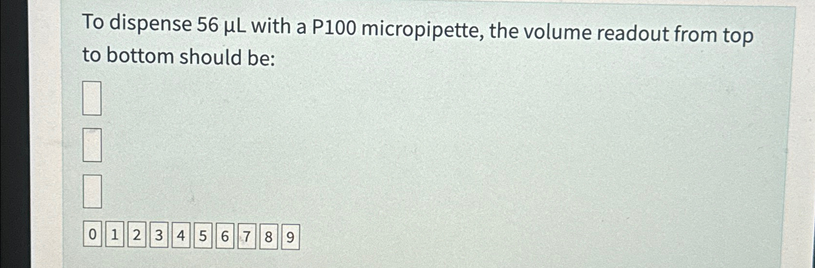 Solved To dispense 56μL with a P100 micropipette, the P100 Micropipette Volume Set the volume only within the. the most common micropipettors are the p20 (which measure volumes from 2.0‐20.0 l), the p200 (which measure volumes from 20.0‐200.0 l), and the p1000. Attach the tip by inserting the shaft of the. here are the general steps for setting a micropipettor: the examples below show how to read the volume. P100 Micropipette Volume.